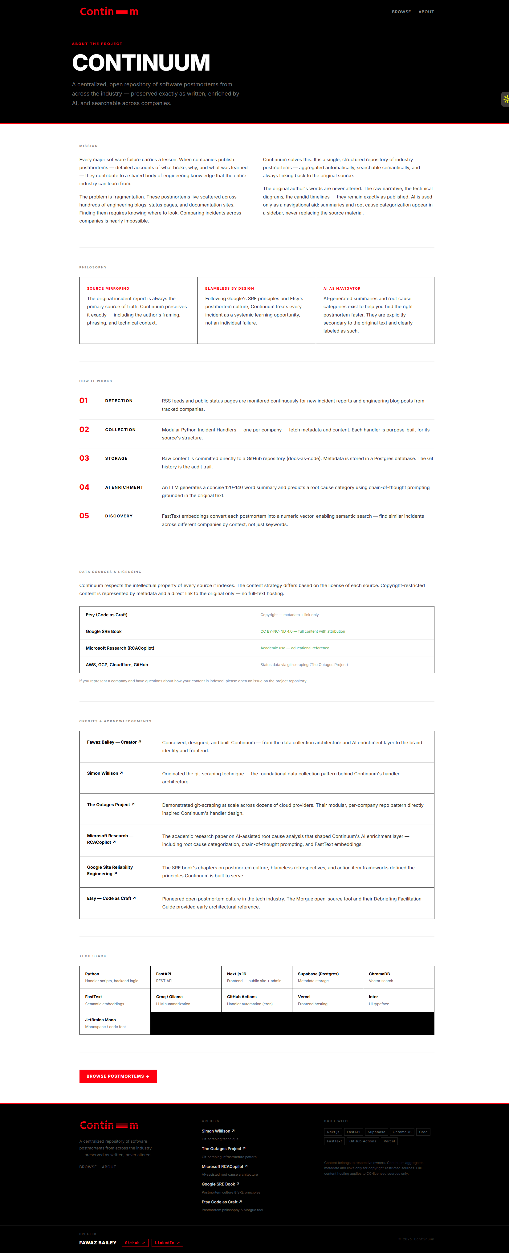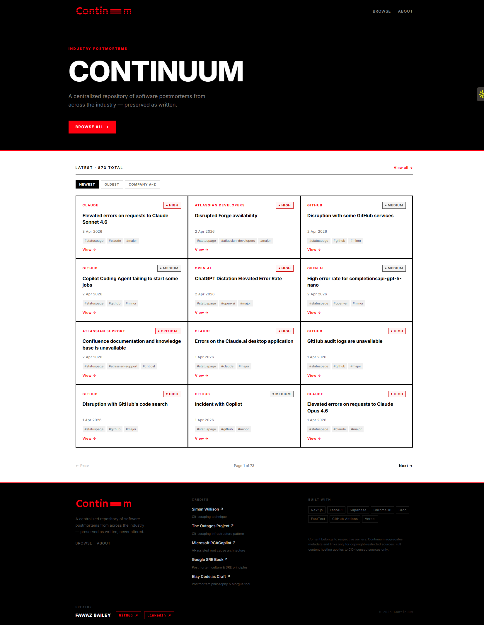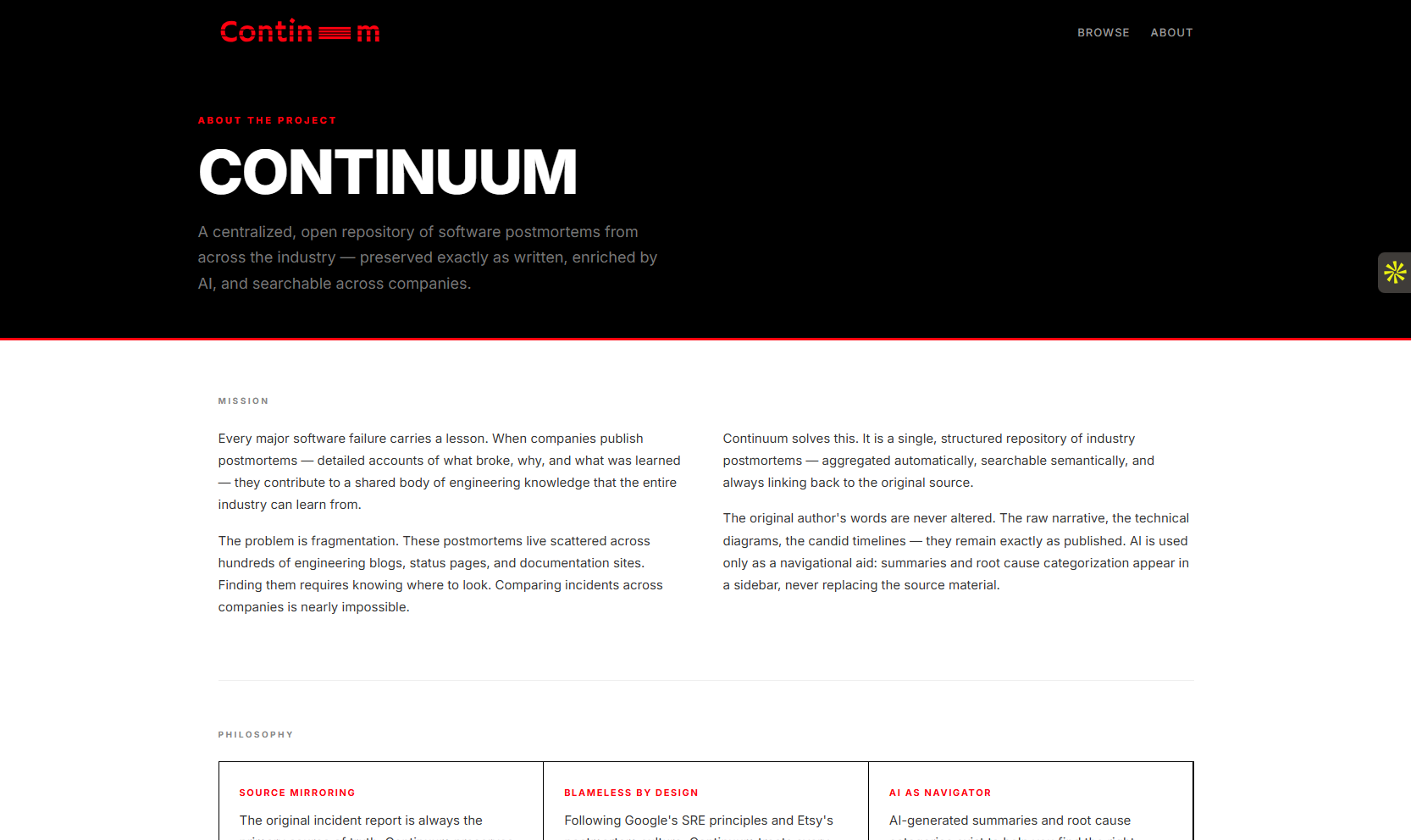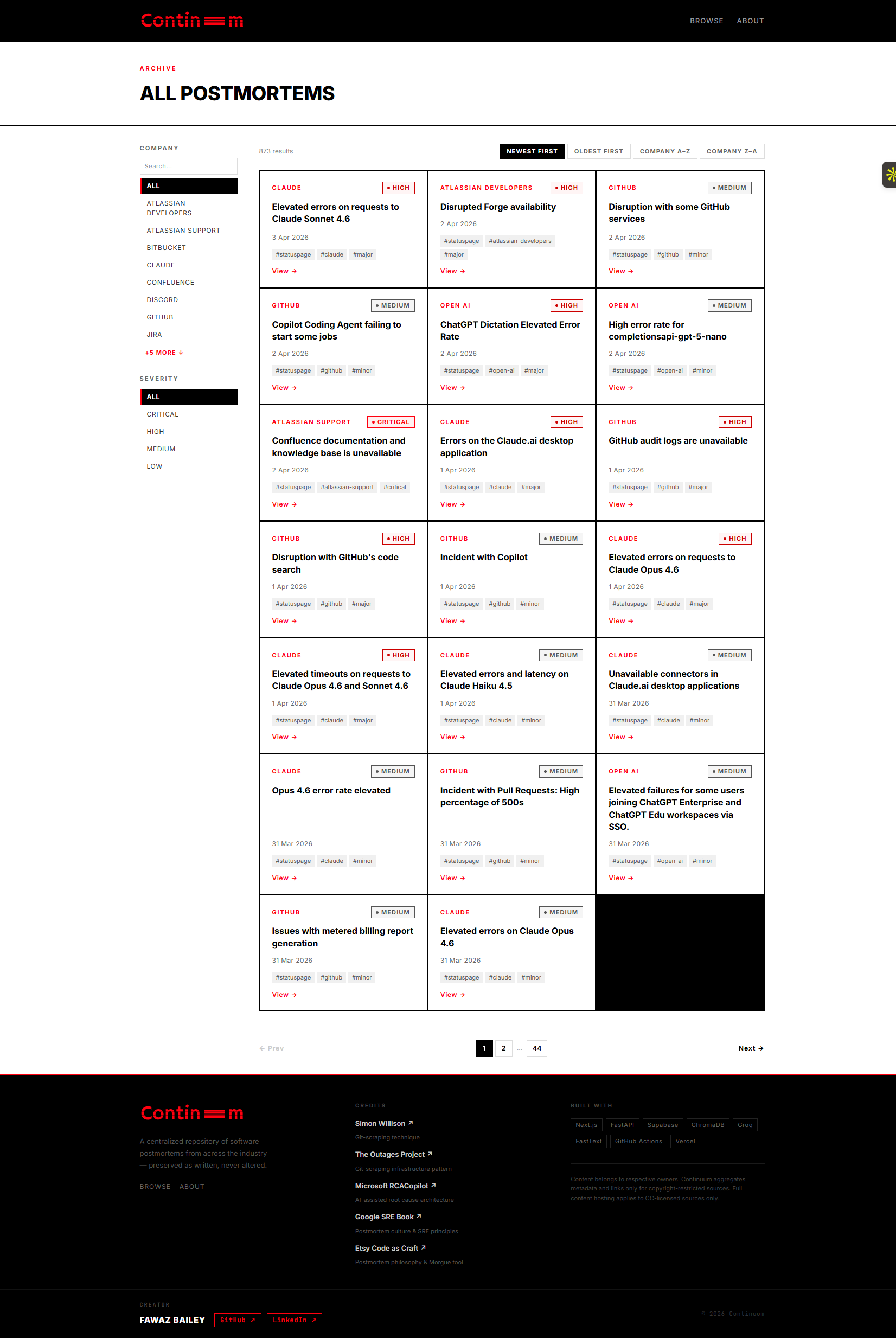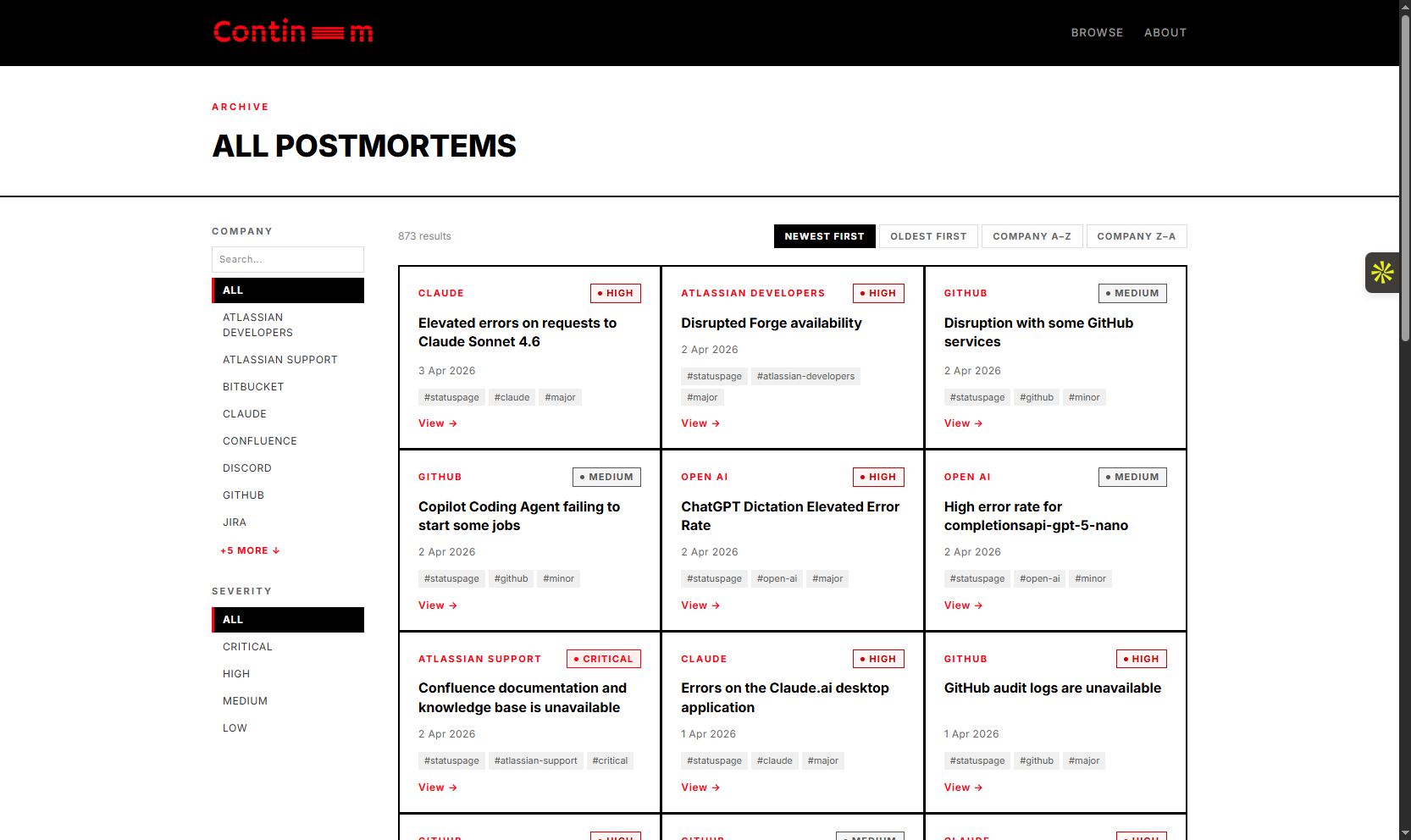 Centralized web-based archive of original software postmortems from major tech companies — preserved exactly as published, narrative and all.
