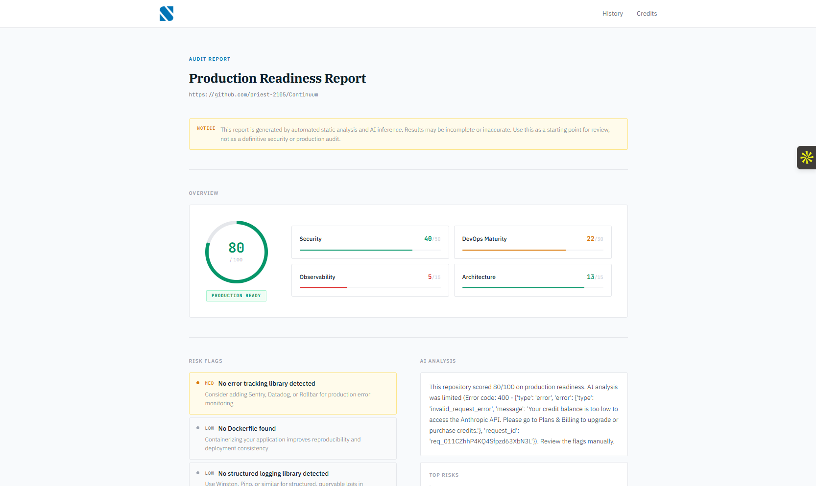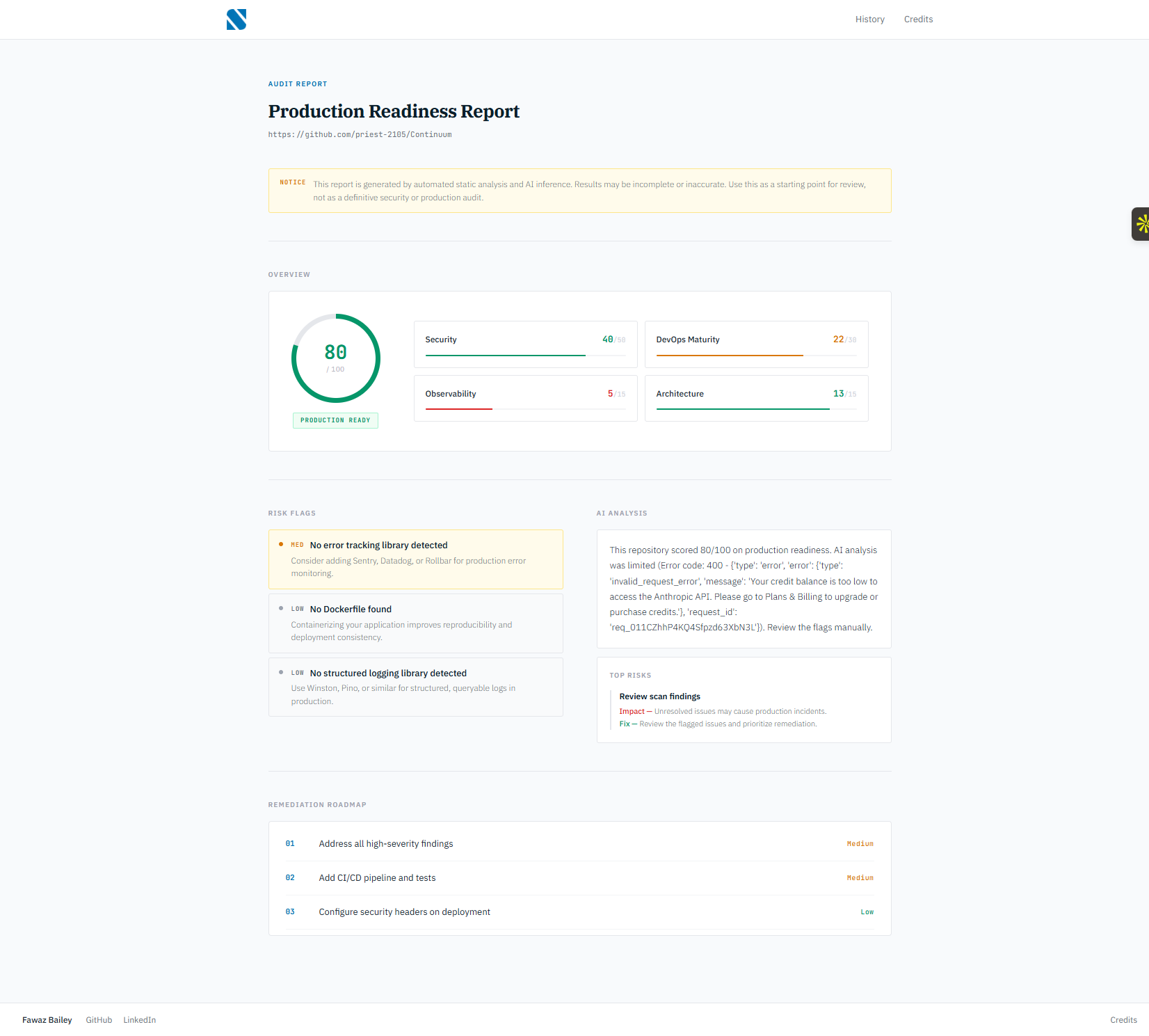 Evaluates how production-ready a software project is by analyzing repo structure, deployment config, and engineering standards.